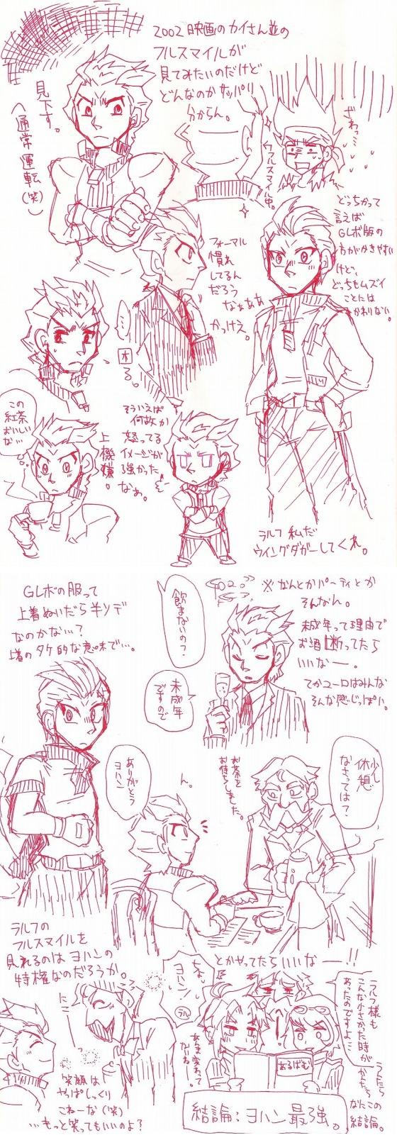 無表情とかムッとしているか嘲笑っているみたいな顔が多かったせいか、嬉しそうな顔を描こうとするとマジで誰おま状態になる現状をなんとか打破したいとは思いつつも、フルスマイルのラルフが見られるのはヨハンの特権なんだよ!と考えるとなんかもう、それでいいやって気にもなります。